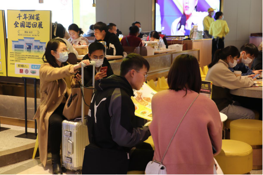 上午十一點,店鋪才開始準備營業(yè),這會兒已經(jīng)有客人在等位了。慢慢地,人也漸漸多了起來,店內座無虛席,一輪又一輪,店外還圍著一大圈等待就餐的人,甚至還有拖著行李箱過來打卡的,而且這天還不是周末。據(jù)工作人員介紹,自試運營以來,每天都有很多人過來排隊打卡,一天可達2000多桌。