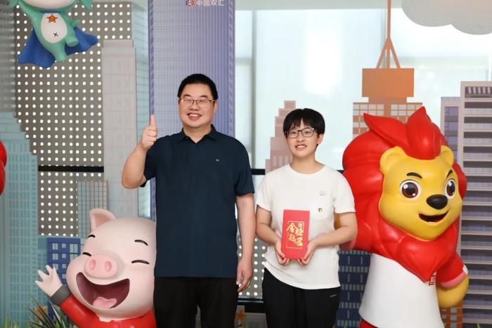 雙匯發(fā)展 副總裁周霄 為職工子女代表發(fā)放獎(jiǎng)學(xué)金并合影留念