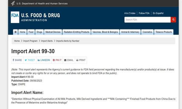 記者查閱美國(guó)FDA官網(wǎng)看到,目前美國(guó)對(duì)中國(guó)的進(jìn)口警報(bào)涉及三聚氰胺的共有三項(xiàng),都是從2008年發(fā)布,在之后陸續(xù)進(jìn)行過修訂,但一直沒有取消,警報(bào)顯示,所有來自中國(guó)的奶制品和含有乳源成分的食品,比如餅干、蛋糕、軟糖等,也都在進(jìn)口警報(bào)范圍中。