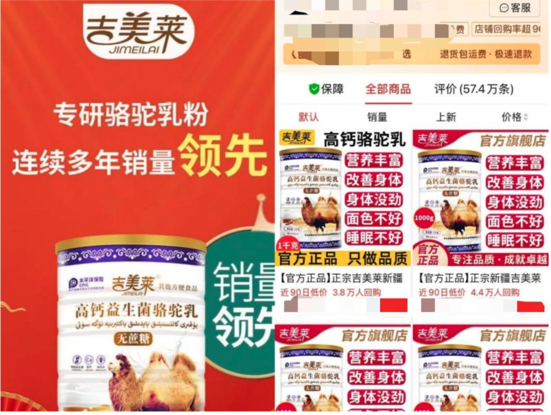 在某電商平臺的年度駝奶粉暢銷榜上,一款名為“吉美萊高鈣益生菌駱駝乳”的產(chǎn)品位居榜首。該產(chǎn)品的銷售店鋪?zhàn)苑Q為官方旗艦店,打著官方正品的旗號標(biāo)榜自身權(quán)威。店鋪頁面用大字號宣傳產(chǎn)品具有 “營養(yǎng)豐富、改善身體、身體沒勁、面色不好、睡眠不好” 等功效性暗示標(biāo)語。這款產(chǎn)品售價69.9元一罐,每罐凈重1000克,包裝整體以西域特色圖案和雙峰駱駝為背景,宣稱“專研駱駝乳粉、連續(xù)多年銷量領(lǐng)先”,看上去很容易讓人感覺這就是貨真價實(shí)的駝奶粉。