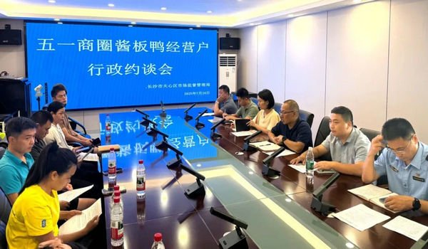 7月24日下午,天心區(qū)市場監(jiān)管局結(jié)合制售假劣肉制品專項(xiàng)整治行動工作,聯(lián)合坡子街街道辦事處、五一商圈管委會對商圈內(nèi)117家醬板鴨經(jīng)營主體共76個法定代表人(負(fù)責(zé)人)進(jìn)行集體行政約談。