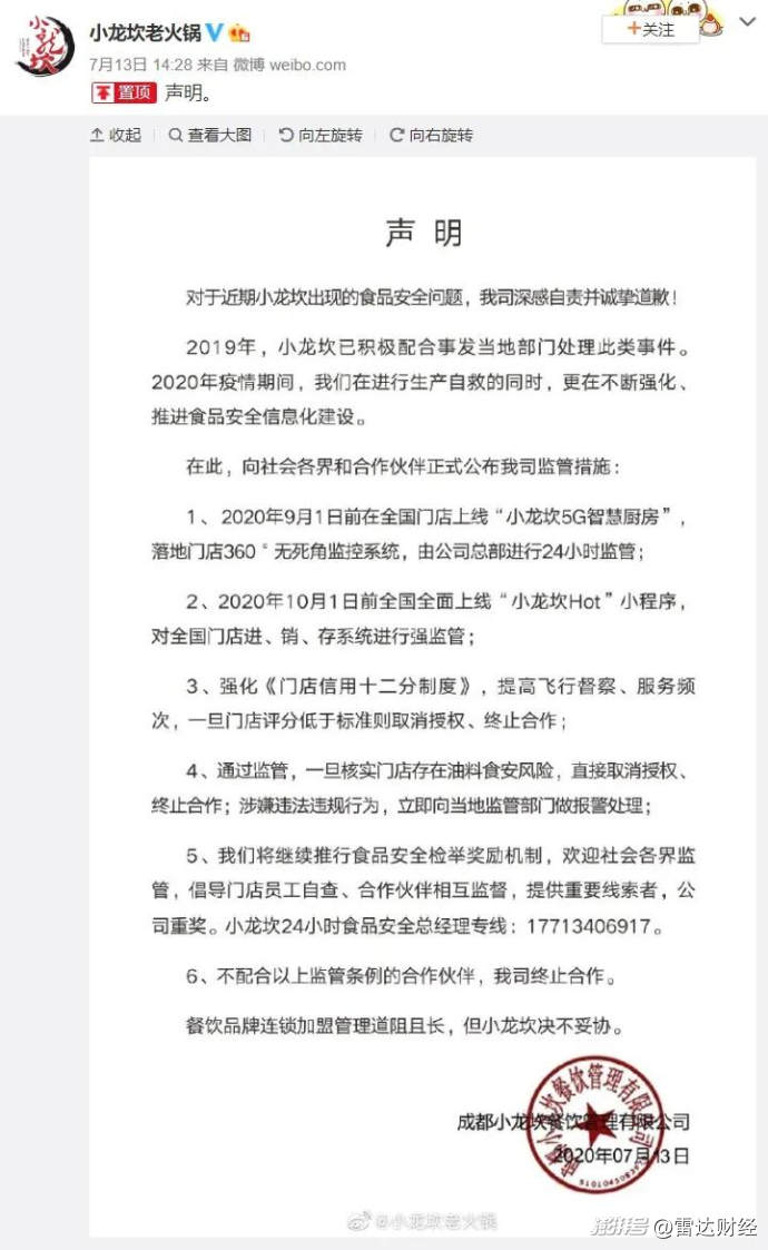 雷達(dá)財(cái)經(jīng)注意到,事件再次被頂上熱搜后,小龍坎曾發(fā)布保證聲明中承諾的一條整改措施包含了“落地門(mén)店360度無(wú)死角監(jiān)控,由公司總部進(jìn)行24小時(shí)監(jiān)管”。