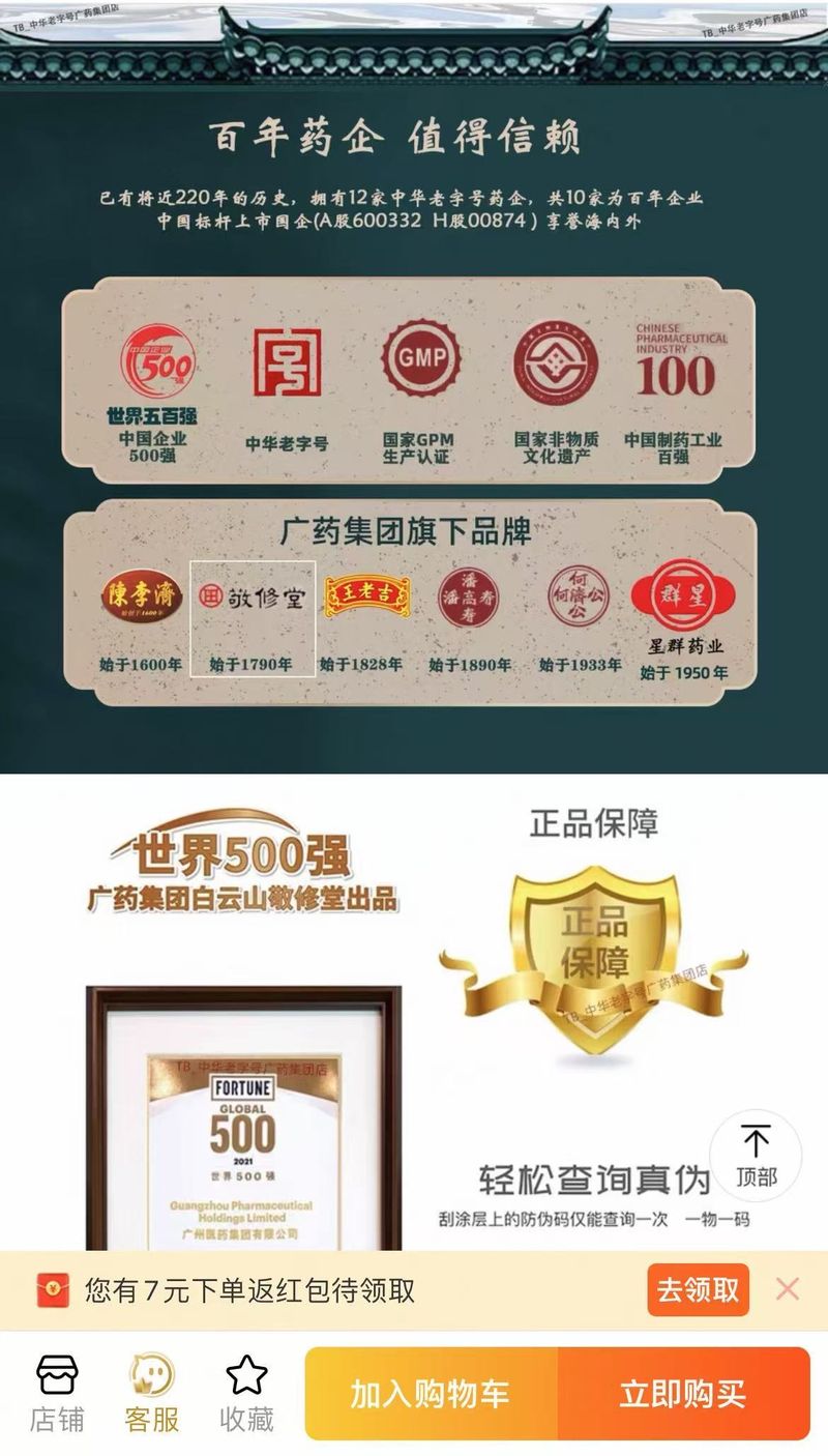 記者還發(fā)現(xiàn),在售賣(mài)相關(guān)產(chǎn)品時(shí),背后的知名藥企也是商家宣傳的一大“賣(mài)點(diǎn)”。上述三款雞內(nèi)金相關(guān)產(chǎn)品的外包裝商標(biāo),均明顯標(biāo)示有白云山、哈藥集團(tuán)、仁和的品牌標(biāo)識(shí)。其中,中華老字號(hào)廣藥集團(tuán)店更是將廣藥集團(tuán)作為一大“賣(mài)點(diǎn)”專(zhuān)門(mén)介紹,提及“已有將近220年的歷史,擁有12家中華老字號(hào)藥企業(yè),共10家為百年企業(yè)”,以此來(lái)增加產(chǎn)品的可信度。