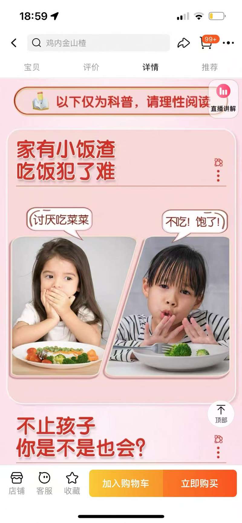 其中,在哈藥官方旗艦店的山楂雞內(nèi)金益生菌咀嚼片的視頻介紹中,提到“孩子老是不愛(ài)吃飯,挑食厭食;讓寶寶胃口好,吃飯香;寶寶不愛(ài)吃飯的、厭食的、討厭吃菜的,還有大人胡吃海喝的、油膩的,放在家中,就是開(kāi)胃的小法寶”等內(nèi)容,店鋪客服也在回答記者關(guān)于產(chǎn)品適用情況的咨詢(xún)時(shí)表示,“不管是大人還是寶寶,脾胃不好、胃口不好、挑食厭食、消化不良、便秘都是非常適宜食用的”,并稱(chēng)產(chǎn)品“還添加8種益生菌,讓腸道更健康。”