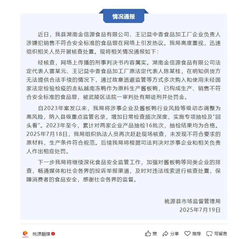 7月19日晚,桃源縣市場(chǎng)監(jiān)督管理局發(fā)布情況通報(bào),稱湖南金信源食品有限公司法定代表人雷某某、王記益中香食品加工廠原法定代表人陳某某,在明知供貨方無(wú)法提供合法手續(xù)的情況下,通過(guò)故意逃避監(jiān)管等方式多次購(gòu)入和使用未經(jīng)國(guó)家法定檢驗(yàn)檢疫的走私越南凍鴨作為原料生產(chǎn)醬板鴨,已構(gòu)成生產(chǎn)、銷售不符合安全標(biāo)準(zhǔn)的食品罪,被武陵區(qū)法院一審判處有期徒刑并處罰金。