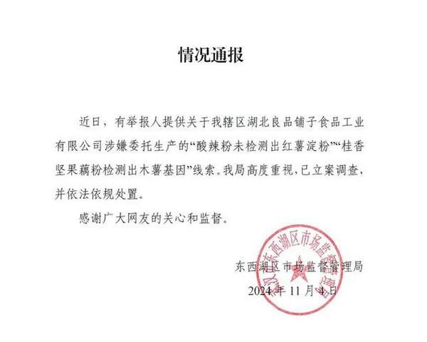 湖南食品安全網(wǎng)訊 11月4日,武漢東西湖區(qū)市場監(jiān)管部門發(fā)布情況通報:近日,有舉報人提供關(guān)于東西湖轄區(qū)湖北良品鋪子食品工業(yè)有限公司涉嫌委托生產(chǎn)的“酸辣粉未檢測出紅薯淀粉”“桂香堅果藕粉檢測出木薯基因”線索。武漢東西湖區(qū)市場監(jiān)管局表示,已立案調(diào)查,并依法依規(guī)處置。