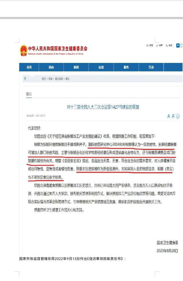 王海說:“國家衛(wèi)生健康委未批準(zhǔn)檳榔作為新食品原料,未將其納入食藥物質(zhì)目錄,檳榔(果實)也不宜制定食品安全標(biāo)準(zhǔn)。國際癌癥研究中心2004年將檳榔確認(rèn)為一級致癌物,長期咀嚼檳榔可增加患口腔癌風(fēng)險。”