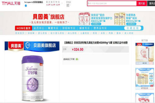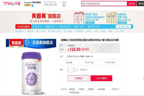 在天貓商城售賣(mài)的貝因美牌舒好敏“兒童營(yíng)養(yǎng)配方奶粉”。