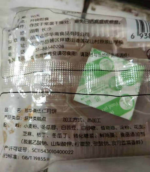 在陳先生出示的一塊“珍華齋”伍仁月餅的產(chǎn)品標(biāo)簽上,記者看到,該產(chǎn)品的名稱(chēng)為珍華齋伍仁月餅,生產(chǎn)企業(yè)為湖南珍華齋食品有限公司,生產(chǎn)地址為長(zhǎng)沙市岳麓區(qū)坪塘街道蓮花山村原茶山學(xué)校,產(chǎn)品執(zhí)行標(biāo)準(zhǔn)為GB/T19855,配料為小麥粉、冬瓜蓉、白蕓豆、白沙糖、植物油、淀粉、花生、芝麻、桔丁、冬瓜丁、轉(zhuǎn)化糖漿、鮮雞蛋、食品添加劑(脫氫乙酸鈉、山梨酸鉀、檸檬酸、碳酸鈉、食用香精香料)。