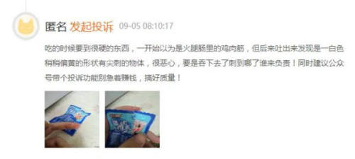 再如,2021年9月5日,一位消費者投訴稱,鹽津鋪子迷你小肉棗中出現(xiàn)異物。“吃的時候要(咬)到很硬的東西,一開始以為是火腿腸里的雞肉筋,但后來吐出來發(fā)現(xiàn)是一白色稍稍偏黃的形狀有尖刺的物體,很惡心,要是吞下去了刺到哪了誰來負責!同時建議公眾號帶個投訴功能別急著賺錢,搞好質(zhì)量!”