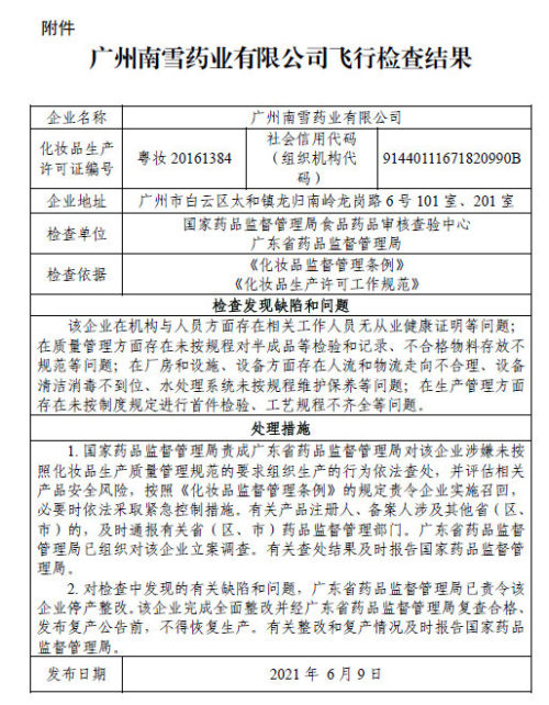 一波未平,一波又起。6月11日,國家藥品監(jiān)督管理局發(fā)布關(guān)于廣州南雪藥業(yè)有限公司飛行檢查結(jié)果的通告,由于該企業(yè)違反了《化妝品監(jiān)督管理?xiàng)l例》、《化妝品生產(chǎn)許可工作規(guī)范》等有關(guān)規(guī)定,該局已責(zé)成廣東省藥品監(jiān)督管理局責(zé)令該企業(yè)停產(chǎn)整改,并對(duì)該企業(yè)立案調(diào)查。